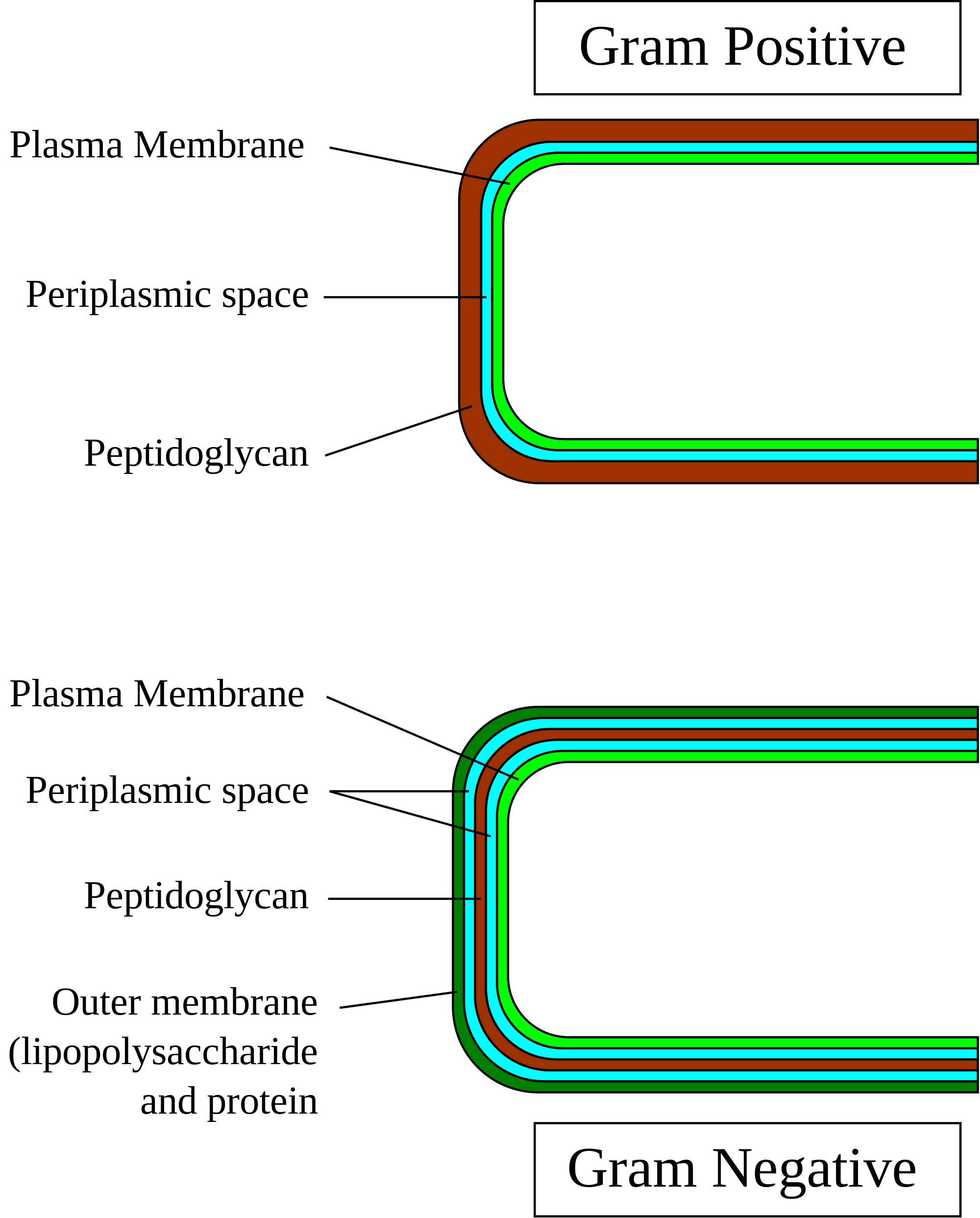 Gram-negative bacteria: These bacteria have a thin layer of peptidoglycan-a meshlike polymer—between their inner and outer cell membrane. Gram negative and gram positive bacteria are differentiated by Gram staining (gram negative bacteria appear pink after identification staining). Example: E. coli